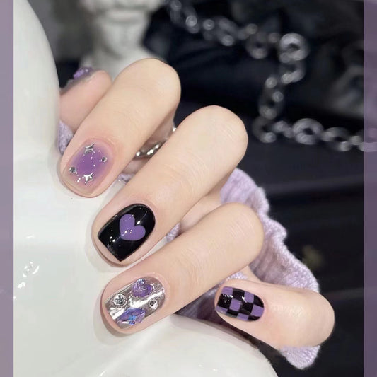 Handmade nail, press on nail, dark purple color, Millennium Girl, silver magic mirror, chessboard pattern nail art