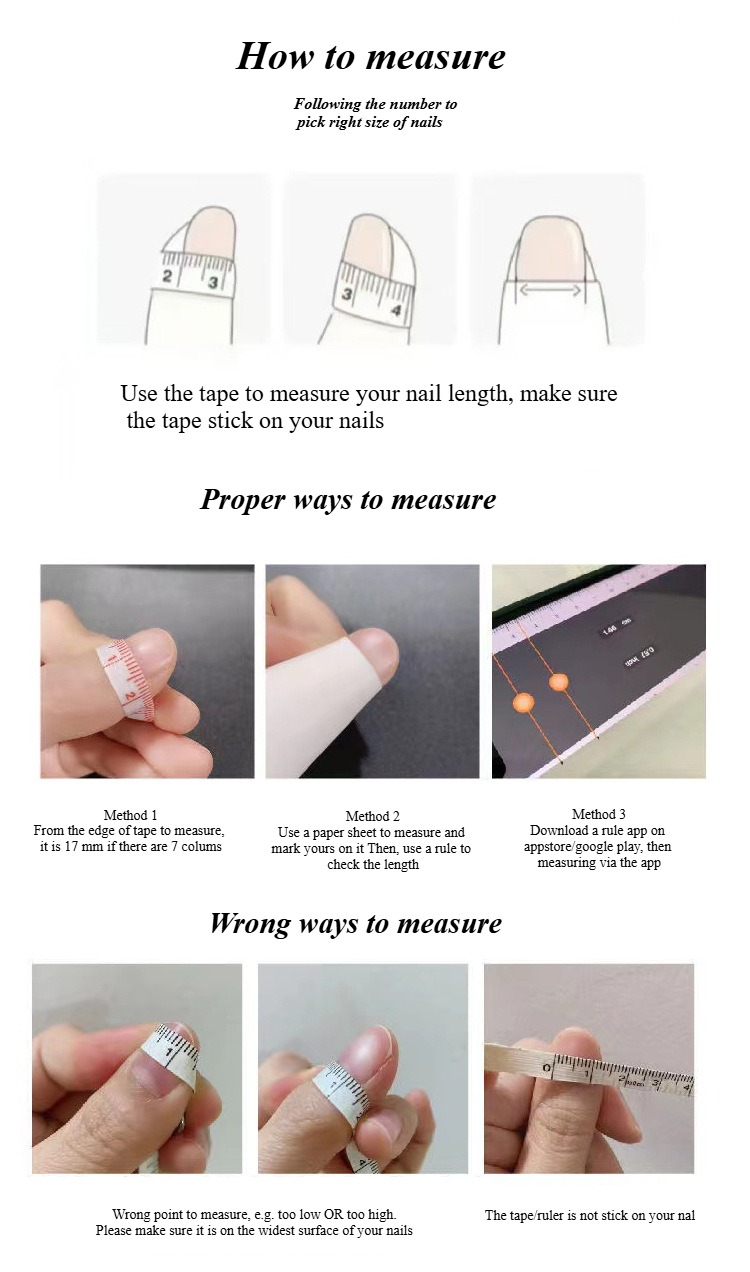Measure the width of your nails using a soft tape measure, paper, ruler, or other tools at home, and then choose the size that suits you based on the measurement table we provided